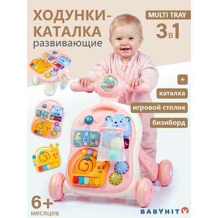 Ходунки — каталка 3в1 с бизибордом станет отличным выбором в качестве развивающей игрушки для малышей, которые начинают вставать на ножки! Мультифункциональная модель Multi Tray от бренда «Babyhit» легко трансформируется в игровой столик с разными подвижными элементами, которые ребенку интересно трогать и разглядывать. Игрушка помогает научиться ходить и закрепить новые двигательные навыки. Она способствует развитию мелкой моторики и сенсорного восприятия. Детская каталка поддерживает три способа игры — «сидим и играем», «стоим и ходим» и «стоим и играем». Она сделано из прочного и безопасного пластика. Продуманная конструкция имеет ручки для удобного хвата с возможностью регулировки высоты в 2-х положениях. Она подходит для домашних игр и уличных прогулок. Ходули с бизибордом станут замечательным приобретением для маленьких мальчиков и девочек, начинающих ходить. Они рассчитаны на деток в возрасте от 9 месяцев. Это настоящий многофункциональный развивающий игровой центр, который можно приобрести в качестве подарка для мальчика или девочки. Съемная интерактивная панель включает тактильно приятные шестеренки, книжку с картинками, баскетбольное кольцо с шариками и съемную игрушку-улитку. Игрушка-улитка со звуковыми эффектами работает на 2-х батарейках типа АА (нет в комплекте).