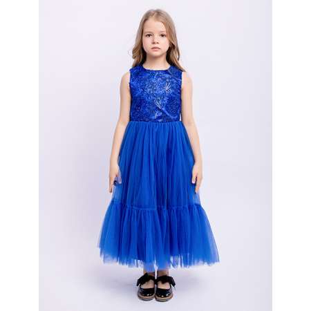 Нарядное синее длинное платье без рукавов с пышной юбкой из фатина. Гипюр на лифе, декоративный бант на поясе сзади. На спинке имеется поясок, чтобы дополнительно утянуть талию. Подкладка 100% хлопок. Праздничное детское платье можно использовать как новогоднее, вечернее, школьное, на выпускной.