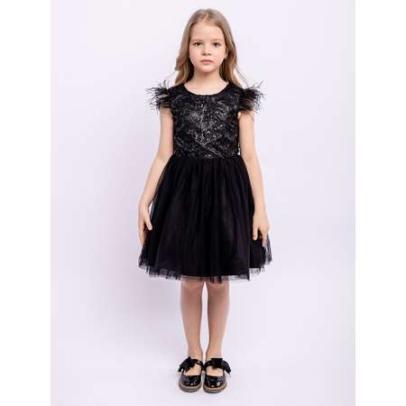 Нарядное платье с пышной юбкой из фатина. Гипюр на лифе, рукава из перьев. На спинке имеется поясок, чтобы дополнительно утянуть талию. Подкладка 100% хлопок. Маленькое черное платье для юной леди на любом торжестве будет смотреться уместно и элегантно.