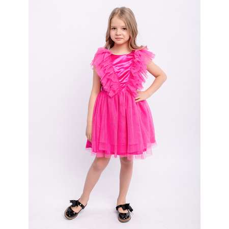Нарядное платье с пышной юбкой и рюшами из фатина, с декоративным бантом на поясе сзади. На спинке имеется поясок, чтобы дополнительно утянуть талию. Подкладка 100% хлопок.