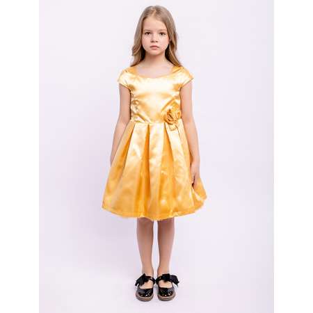 Нарядное желтое платье с пышной юбкой, декоративными цветами на поясе. Подкладка 100% хлопок. Сетка и ткань верха 100% полиэстер. Блестящее атласное платье с короткими спущенными рукавами. Однотонное платье с завязкой на спинке и декоративным цветком на поясе.