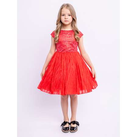 Легкое красное платье из хлопка с юбкой с трикотажной принтованной сеткой. Ткань верха 100% хлопок, сетка 100% полиэстер. Лиф украшен узором из пайеток. Очаровательное мини-платье подойдет для праздника в детском саду.