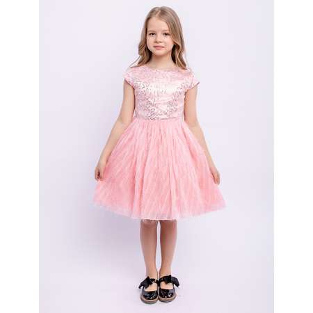 Легкое персиковое платье из хлопка с юбкой с трикотажной принтованной сеткой. Ткань верха 100% хлопок, сетка 100% полиэстер. Лиф украшен узором из пайеток. Очаровательное мини-платье подойдет для праздника в детском саду.