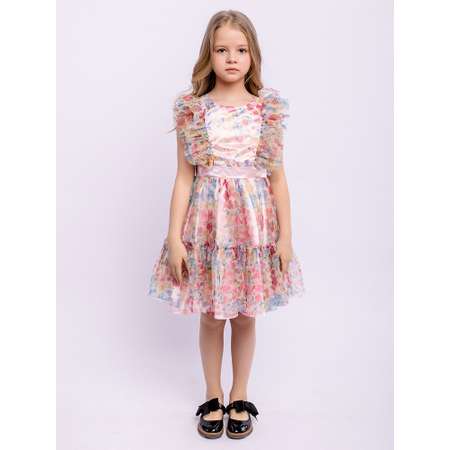 Легкое платье из хлопка с юбкой с трикотажной принтованной сеткой. Ткань верха 100% хлопок, сетка 100% полиэстер. Круглая горловина, лиф украшен вертикальными оборками. Атласный пояс, низ юбки с широкой оборкой. Нежный цветочный рисунок.
