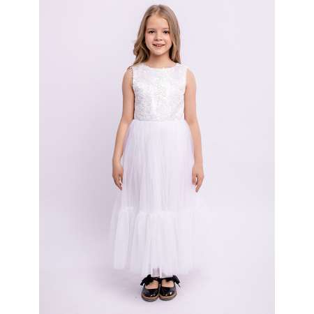 Нарядное белое длинное платье без рукавов с пышной юбкой из фатина. Гипюр на лифе, декоративный бант на поясе сзади. На спинке имеется поясок, чтобы дополнительно утянуть талию. Подкладка 100% хлопок. Праздничное детское платье можно использовать как новогоднее, вечернее, школьное, на выпускной.
