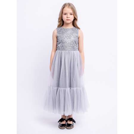 Нарядное серое длинное платье без рукавов с пышной юбкой из фатина. Гипюр на лифе, декоративный бант на поясе сзади. На спинке имеется поясок, чтобы дополнительно утянуть талию. Подкладка 100% хлопок. Праздничное детское платье можно использовать как новогоднее, вечернее, школьное, на выпускной.