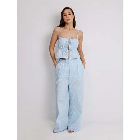 Женские домашние брюки из хлопка — это неотъемлемая деталь гардероба, которая подарит уют и комфорт, подчеркнутые ноткой стиля. Качественный хлопковый материал в голубую полоску приятно ощущается на коже и делает модель подходящей для повседневного длительного ношения. Утонченная белая вышивка с цветочками добавляет изделию милый акцент. Женские домашние брюки на резинке комфортно садятся на разные типы фигуры, а карманы в боковых швах добавят практичности. Модель подходит для домашнего отдыха, сна или пижамной вечеринки с друзьями. Домашние брюки в полоску составят стильный тандем с комплектным топом на завязках (31200210026).