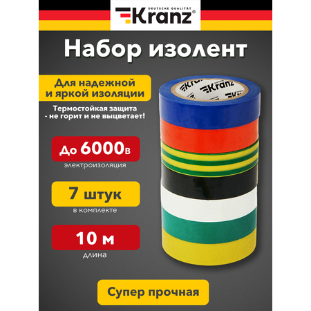 В наборе семь ПВХ-изолент разных цветов, принятых в электротехнике: черного, белого, синего, красного, зеленого, желтого и зелено-желтого.