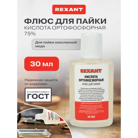Ортофосфорная кислота REXANT предназначена для удаления оксидов с поверхности под пайку, улучшения растекания жидкого припоя при пайке окисленной меди, нержавеющей стали, черных или цветных металлов. Изготовлена в соответствии с ГОСТ 10678-76. Применяется в качестве флюса при пайке или лужении деталей низкотемпературными припоями. Также используется для очистки от ржавчины металлических поверхностей, образуя защитную пленку и предотвращая образование коррозии.