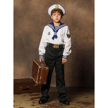 Моряки - это смелые ребята, связавшие свою жизнь с морем, вызывающие восхищение и огромное уважение. Костюм Моряка для мальчика отлично подойдет для празднования Дня Военно-Морского Флота, а также таких праздников как 23 февраля, 9 мая, Новый год. Это прекрасный способ поздравить папу или дедушку, а также интересно и ярко отметить праздник, участвуя в детском параде, спектакле или представлении. В комплекте образа рубашка, брюки, ремень и бескозырка.