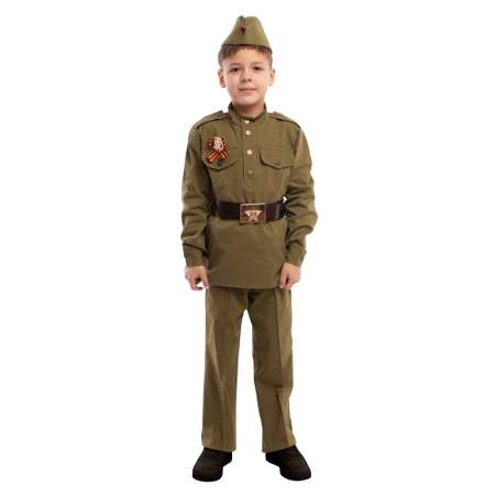 Костюм для мальчика "Солдат" представляет собой копию формы советского солдата. Патриотичный костюм будет актуален к празднику 9 мая. В комплект костюма входит гимнастерка, брюки прямого покроя, пилотка, ремень. Приятным бонусом, дополняющим тематику костюма, станут Георгиевская лента и орден. Комплектация: гимнастерка, брюки, пилотка, ремень, георгиевская лента.