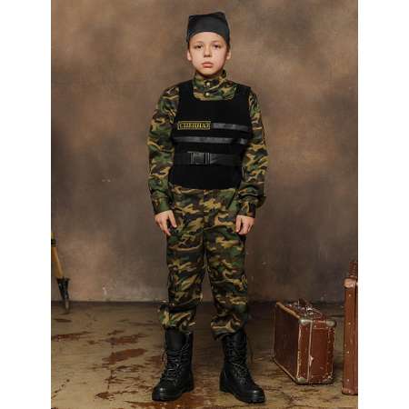 Костюм Спецназ будет актуален к различным праздникам, как военной тематики, так и других (Новый год, костюмированный день рождения). Такой костюм точно понравится папе и дедушке, особенно если они были на военной службе. Отличный вариант костюма для постановки номеров и подготовки поздравлений к дню Защитника Отечества 23 февраля. В комплекте костюма Спецназовец рубашка, брюки, бронежилет, автомат, граната, бандана.