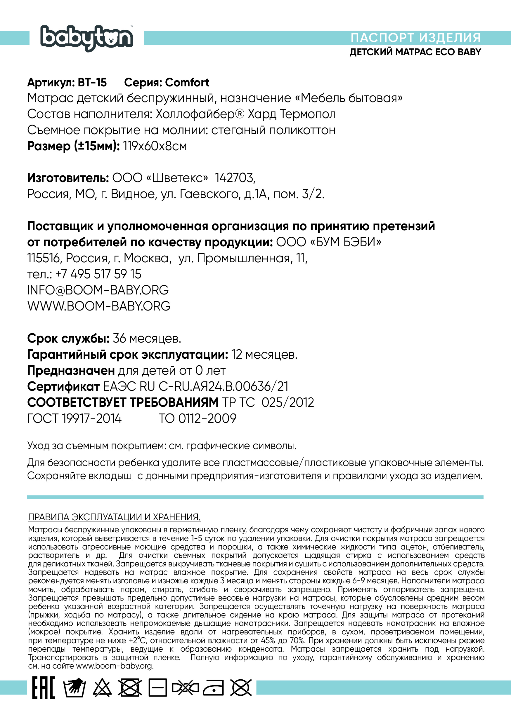 Матрас Babyton Eco Baby 120*60см BT-15