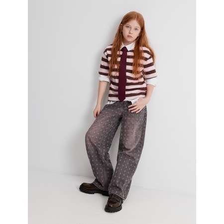 Джинсы для девочек Baggy fit, выполненные из 100% хлопкового денима. С застежкой на молнию и пуговицу, с поясом со внутренней эластичной лентой для регулировки размера по талии. Средняя посадка. Модель с пятью карманами. По бокам на поясе ремешки из основной ткани в качестве декоративного элемента, ремешки могут быть использованы для дополнительной регулировки размера.