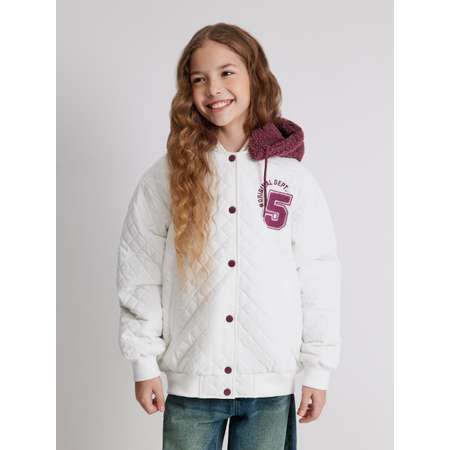 Утеплённый бомбер для девочки — оригинальный модный выбор для демисезона. Белый бомбер изготовлен из качественной ткани с водоотталкивающей пропиткой, которой не страшны мелкий дождь, туман и сырость. Модель утеплена синтепоном (вес 120г/м2), что делает комфортным ношение при температуре от 0 до +15 градусов. Подкладка выполнена из стандартной подкладочной ткани. Съемный капюшон из искуственного меха со шнурком для утяжки придаст образу спортивную нотку. Спереди расположена центральная застежка на контрастные кнопки. Два функциональных прорезных кармана надежно сохранят содержимое. Короткий воротник, низ изделия и рукавов оформлены трикотажными манжетами для лучшего прилегания к телу и сохранения тепла. Стеганый бомбер украшает контрастная вышивка-букле на переде и спинке с номером игрока и надписями "ORIGINAL DEPT. | PERFECT" англ. — "Оригинальный департамент | Идеальная". Бомбер для девочки-подростка позволит создавать оригинальные стильные образы с джинсами или юбкой в складку.