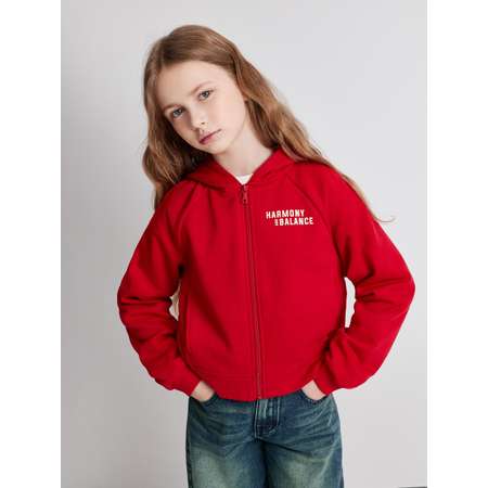 Детское худи на молнии составит отличную базу для спортивных образов девочки. Зипка изготовлена из хлопкового футера с петлями на изнанке (без начеса), что делает ее идеальной для длительного ношения. Модель свободной посадки со спущенной линией плеча дарит свободу и легкость движений, которая особенно важна для спортсменок и активных девочек. Красная толстовка с капюшоном застегивается спереди на молнию, которая делает одевание легким и быстрым. Пуллер молнии украшен прорезью в виде сердечка, что добавляет изделию милый штрих. Карманы в боковых рельефных швах добавляют модели практичности. Спереди худи украшено принтом с умиротворяющей надписью "HARMONY AND BALANCE" англ. - "Гармония и баланс". Яркая толстовка на молнии для девочки составит стильный образ на каждый день с полосатым лонгсливом и широкими джинсами.