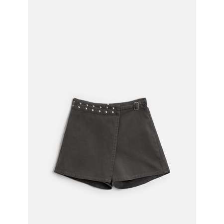 Юбка-шорты трапециевидного силуэта из твила. По переду шорты на молнии. Имеется запашной элемент, создающий имитацию юбки. На спинке выполнена треугольная кокетка и накладные карманы. В пояс вствлена резинка. По переду изделие декорированно серебристыми заклепками. 20210180265