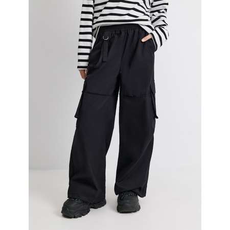Объёмные брюки для девочки из хлопка, расширяются к низу. Пояс на резинке с дополнительной декоративной резинкой по верху. По центру выполнена имитация гульфика. По линии чуть выше колен выполнены горизонтальные декоративные швы. Имеются карманы в боковых швах, а так же по бокам на уровне колен расположены объёмные накладные карманы. В манжеты всталены резинки с дополнительной возможнотью регуляровки. По правому боку изделия расположен декоративный элемент с лентой из основной ткани и серебристыми D-образными колцами. 20210160492