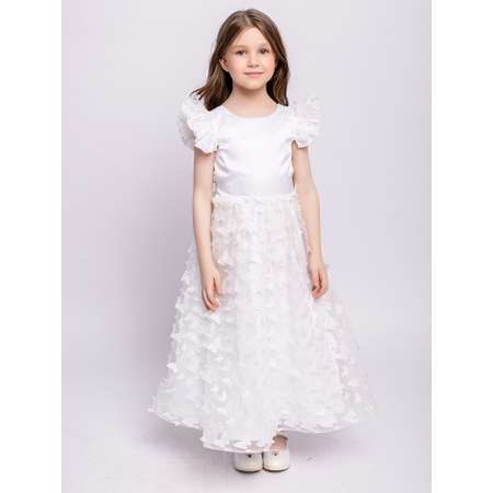 Нарядное платье Рэйчел белое с пышной юбкой и шлейфом. На спинке имеется поясок, чтобы дополнительно утянуть талию. Подкладка 100% хлопок. Платье украшено объемным узором в виде бабочек. Короткие рукава с оборками. Платье подойдет для празднования выпускного, дня Рождения, Нового года.