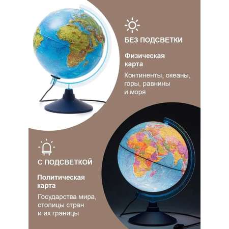 Глобус включает в себя две карты: с выключенной подсветкой вы видите физическую карту мира, при включении подсветки – политическую карту мира. Это делает глобус практичным и долговечным в использовании – пригодится школьнику для изучения окружающего мира, географии, истории и экономики.