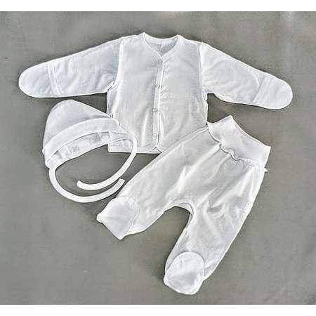 Комплект для новорожденного состоящий из кофточки с рукавом -антицарапки,ползунков на еврорезинке ,шапочки. Все швы выполнены наружу для максимального комфорта малыша. Комплект изготовлен из 100% хлопка-кулирная гладь.