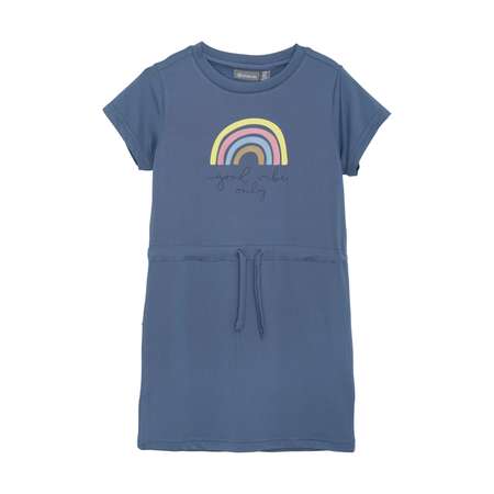 Красивое синее платье с симпатичным рисунком радуги спереди и сборкой на талии придаст образу легкости и будет стильно смотреться с сандалиями или босоножками! Это платье с короткими рукавами и завязками на талии изготовлено из эластичного и дышащего материала, который быстро сохнет. Благодаря 90% полиэстера и 10% эластана в составе изделие будет отлично сидеть по фигуре и в нем не будет жарко даже при высокой температуре. Платье идеально подойдет для пляжа и станет любимой вещью не только юной модницы, но и ее родителей — трикотаж не мнется и неприхотлив в уходе.