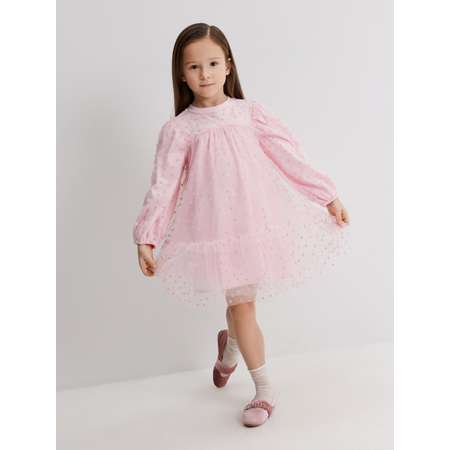 Платье для девочек, трапецивидного силуэта, длиной чуть ниже колена. На полочке и спинке имеется кокетка, выполнена из одного слоя декоративной сетки с флокированными сердечками и хлопковой трикотажной подкладки. Сзади вырез-капелька и застежка на петлю и пуговицу. Юбка, расширяющаяся к низу, выполнена из трех слоёв сетки, самый верхний, из которых с флокированными сердечками, и хлопковой трикотажной подкладки. Верхний слой юбки разделеён па горизонтали на два яруса. Рукава обьёмные с резинками на манжетах. Изделие декорированно рюшами по плечевым швам, по низу кокетки и между ярусами юбки. 20220200906