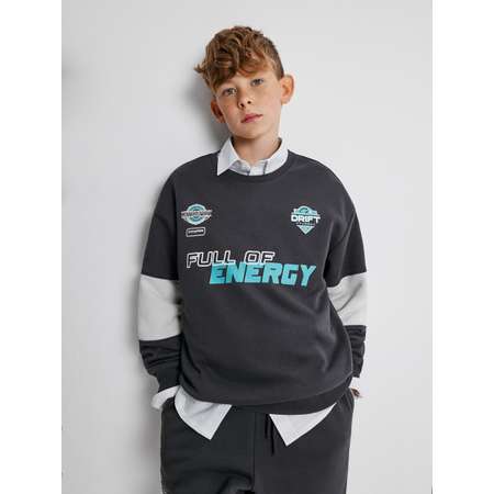 Свитшот для мальчика сочетает в себе стильный принт на тему мотогонок и качественные материалы для комфортного ношения. Модель выполнена из качественного хлопкового футера с петлями на изнанке (без начеса), что позволяет носить ее в любое время года и составлять многослойные сложные образы. Модель свободного кроя COMFORT fit отличается приспущенной линией плеча, а также увеличенными объемом и длиной рукава. Всё это создает объемный модный силуэт и дарит легкость движений, которую так ценят активные дети. Контрастные вставки по рукавам придадут образу заметный акцент. Также свитшот украшен принтом с надписями "FEARLESS | MOTOSPORT | WORLDWIDE | DRIFT TURBO | FULL OF ENERGY" [англ. - "Бесстрашие | Мотоспорт | Всемирный | Турбозанос | Полон энергии"]. Свитшот составит отличный лук с надетой под низ рубашкой и брюками-джоггерами.