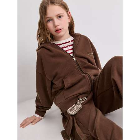 Детское худи на молнии — универсальный и незаменимый элемент гардероба девочки. Зипка изготовлена из хлопкового футера с петлями на изнанке (без начеса), что делает ее идеальной для длительного ношения. Модель свободной посадки со спущенной линией плеча позволяет легко двигаться и создает объемный модный силуэт. Коричневая толстовка с капюшоном застегивается спереди на молнию, которая делает одевание легким и быстрым. Спереди расположены вместительные карманы-кенгуру. Худи украшает небольшой принт с надписью "MY SOUL IS SO WILDE" англ. - "Моя душа такая дикая". Толстовка на молнии для девочки составит стильный спортивный костюм в паре с комплектными брюками-карго (20210460092).