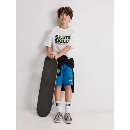 Детский пижамный комплект состоит из оверсайз футболки и шорт, выполненных из хлопкового полотна. Ткань подарит комфорт и удобство во время сна или уютного отдыха. Спущенная линия плеча придает изделию расслабленный вид. Оверсайз футболка не сковывает движения, создавая максимальное удобство в ношении. Спереди расположен принт в виде надписей "SKATE SKILLS|NEVER STOP ROLLING|ESCAPE FROM THE ROUTINE" [англ. - "Навыки катания на скейте|Никогда не останавливайся|Побег от рутины"], что придает изделию стильный акцент. Боковая часть шорт украшена текстовым принтом и принтом в виде скейтборда "TIME TO ROLL" [англ. - "Время прокатиться"]. Эластичная резинка на талии обеспечивает удобную посадку. Этот пижамный комплект станет прекрасным дополнением к гардеробу ребенка, идеально подходя для уютных вечеров или комфортного сна.