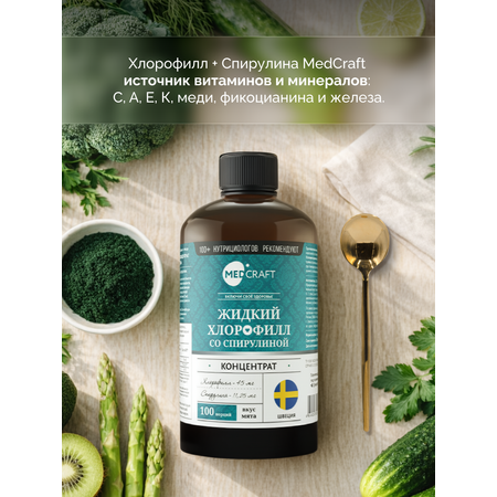 Хлорофилл жидкий со спирулиной от MedCraft, — это концентрированный натуральный продукт. Обладает мощными детокс- и антиоксидантными свойствами, усиленными за счет синергетического действия основных компонентов.