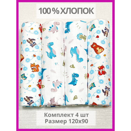 Пелёнка Делоникс Еноты + Бирюзовые Динозавры ситец 90х120 см 4 шт.