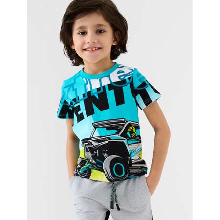 Детская футболка для мальчика. Модель прямого кроя, выполнена из эластичного хлопкового трикотажа джерси. Крупный принт в гоночной тематике. Горловина круглая, обработана эластичным рибом.