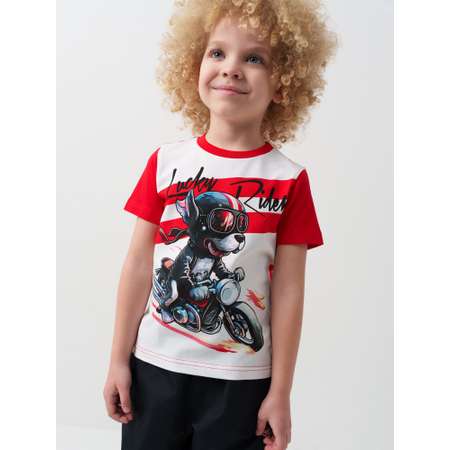 Детская футболка для мальчика. Модель прямого кроя, выполнена из эластичного хлопкового трикотажа джерси. Спереди расположен крупный принт в гоночной тематике. Горловина круглая, обработана эластичным рибом.