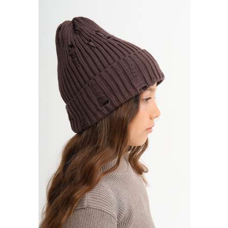 Рваная шапка от MiniDino – must-have этого сезона! Модная и оригинальная Вязаная шапка из хлопка (50 %) и акрил (50 %) плотной вязки в стиле гранж шоколад.