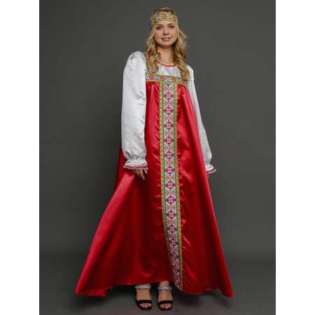 Этот запоминающийся образ станет украшением любого костюмированного торжества, стилистически дополнит тематический номер или порадует детей на новогодней елке. Карнавальный костюм для женщин Марья Искусница включает в себя сарафан и головную повязку. Особенности: Красный длинный сарафан Ленты с народным орнаментом на лямках и вдоль сарафана Широкая повязка на голову