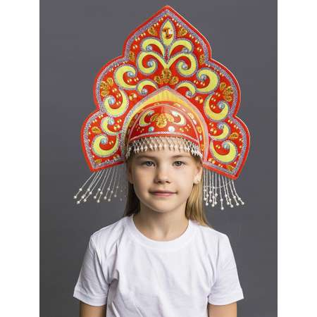 Кокошник Русская красавица красно-золотой. Кокошник русский традиционный народный из фетра поможет создать незабываемый праздничный образ к любому мероприятию. Яркий популярный головной убор подойдет для самых разных праздников и фотосессий в русском стиле.