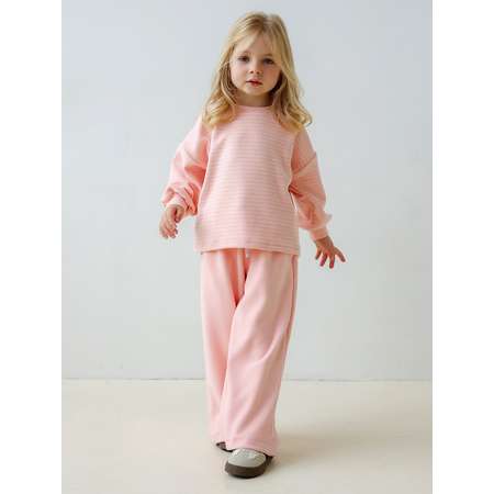 Трикотажная двойка для малышки на прохладное лето и демисезон состоит из детских широких штанов на резинке и мягкой толстовки. Затяжки по внутренней стороне нижнего края штанишек. Станет отличным вариантом для прогулок, игр дома или в детский сад.