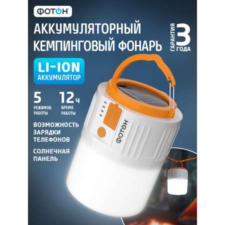 ФОТОН SA-650 — кемпинговый фонарь для тех случаев, когда хочется хороший свет и уверенность, что он будет даже без розетки. Он работает как полноценный лагерный светильник: даёт ровный рассеянный свет по пространству, его можно поставить рядом на стол или подвесить под тентом/в палатке, а ещё он умеет подзаряжаться от солнца и при необходимости поделиться энергией с вашим смартфоном. Идеальный вариант для походов, рыбалки, дачи и домашнего аварийного набора.