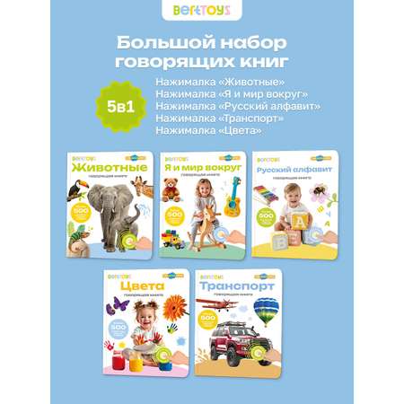 В комплект 5 в 1 входят пять умных говорящих фотокниг для малышей: Животные + Я и Мир вокруг + Русский алфавит + Транспорт + Цвета — идеальный подарок для мальчиков и девочек от 2 до 5 лет.
