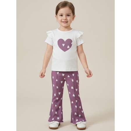 Комплект для девочки футболка и штаны клеш. Костюм детский изготовлен из ткани кашкорсе, 95% хлопок и 5% лайкра. Футболка детская молочного цвета с нашивкой сердечко в цвет брюк. Брюки для девочки с принтом. Костюм для девочки подходит для прогулок, для дома и детского садика, а также на праздник.