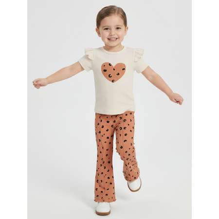 Комплект для девочки футболка и штаны клеш. Костюм детский изготовлен из ткани кашкорсе, 95% хлопок и 5% лайкра. Футболка детская молочного цвета с нашивкой сердечко в цвет брюк. Брюки для девочки с принтом. Костюм для девочки подходит для прогулок, для дома и детского садика, а также на праздник.