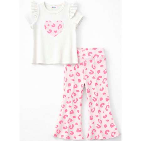 Комплект для девочки футболка и штаны клеш. Костюм детский изготовлен из ткани кашкорсе, 95% хлопок и 5% лайкра. Футболка детская молочного цвета с нашивкой сердечко в цвет брюк. Брюки для девочки с принтом. Костюм для девочки подходит для прогулок, для дома и детского садика, а также на праздник.