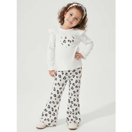 Комплект одежды для девочки — стильный и универсальный вариант для повседневного ношения, прогулок, праздников и фотосессий. В комплект входят лонгслив молочного цвета, розовые брюки клеш с анималистичным принтом и повязка на голову, что позволяет легко создавать завершённый модный образ для малышки. Кофточка украшена нежным сердечком, декоративными крылышками и рюшами понизу рукавов — детали добавляют изящества и индивидуальности. Брюки клеш свободного кроя, не сковывают движения, обеспечивают удобство и свободу даже самым активным детям. Оригинальный анималистичный принт подчеркивает актуальность комплекта. Детский комплект выполнен из эластичного и дышащего материала кашкорсе (состав 95% хлопок, 5% полиэстер), что гарантирует комфорт и гипоаллергенность в течение всего дня. Костюм сохраняет форму и насыщенность цвета даже после множества стирок.