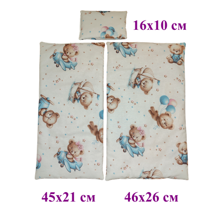 Размеры элементов комплекта: матрас — 46х26×1 см; одеяло —45х25×1 см, подушка прямоугольная— 16х10 см. Важно: кукла и кроватка в набор не входят.