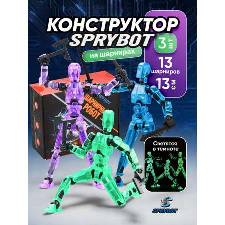 В комплекте 3 сборных Спрайбота разных цветов: синий, зеленый и фиолетовый — каждый в отдельной индивидуальной упаковке.