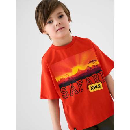 Детская футболка оверсайз для мальчика. Модель, выполнена из эластичного хлопкового трикотажа джерси. Спереди расположен крупный принт. Горловина круглая, обработана эластичным рибом. В нижней части — небольшая нашивка.