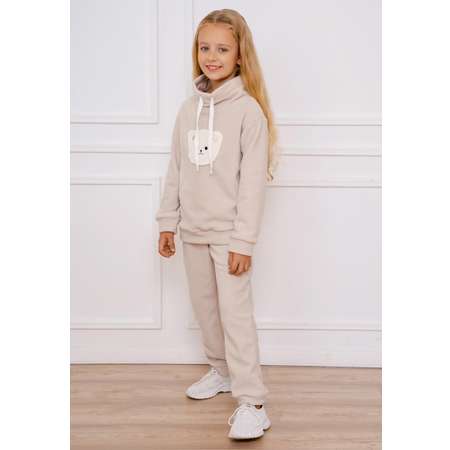 Комплект для девочки включает в себя: худи с высоким горлом на завязках и брюки.