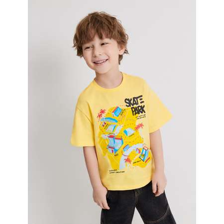 Детская желтая футболка со скейтерским принтом для мальчика — стильный айтем для создания повседневных образов. Футболка изготовлена из дышащего хлопкового трикотажа, который подходит для длительного ношения. Модель посадки comfort предполагает свободный крой, приспущенную линию плеча, а также увеличенные объем и длину рукава. Такой крой позволят юным активным непоседам легко двигаться, бегать и играть. Спереди модель украшена принтом с изображением скейт-парка, а также надписями