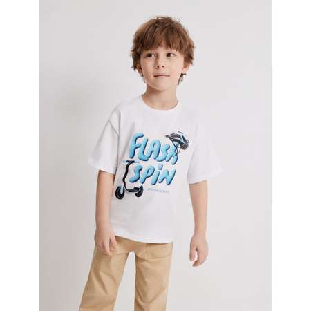 Детская белая футболка с принтом для мальчика — стильный айтем для создания повседневных образов. Футболка изготовлена из дышащего хлопкового трикотажа, который подходит для длительного ношения. Модель посадки comfort предполагает свободный крой, приспущенную линию плеча, а также увеличенные объем и длину рукава. Такой крой позволят юным активным непоседам легко двигаться, бегать и играть. Спереди модель украшена принтом с изображением самоката и шлема, а также надписью